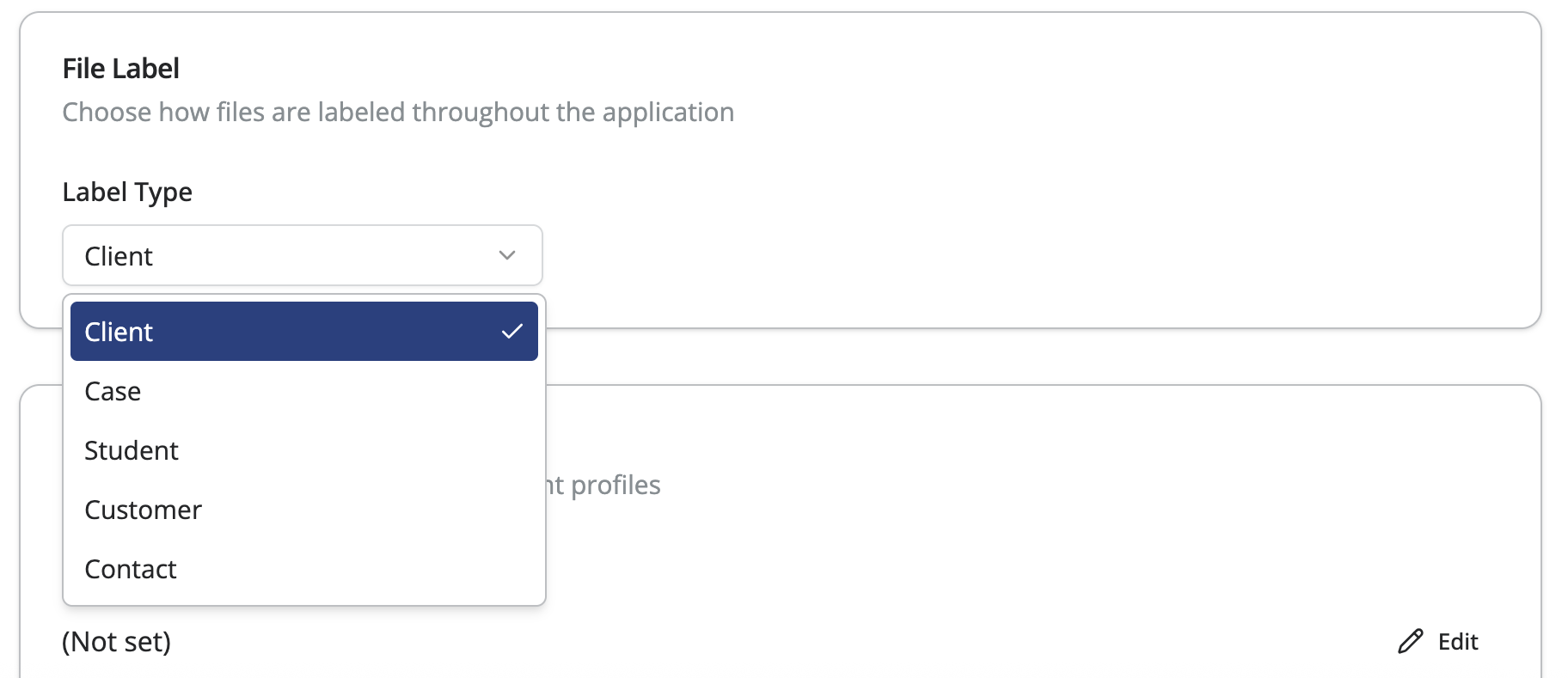 File labels control how Notehouse refers to client work. For example, social workers may prefer Case, while businesses may use Customer. Please note that only the Account Owner can change the file labels.